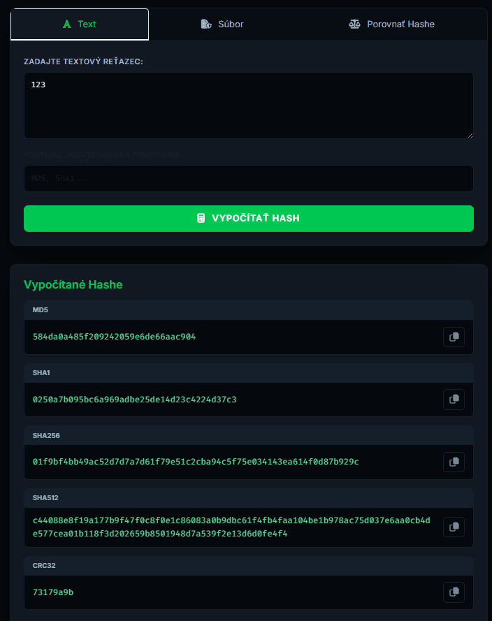 Hashing je dôležitý, pretože zabezpečuje, že súbor nebol počas prenosu alebo uchovávania modifikovaný. Tento PHP skript podporuje upload a vypočítava hash hodnoty pre spustiteľné súbori (.exe), textové dokumenty (.txt), archívy (.zip), obrazové súbori (.jpg, .png) a mnoho ďalších formátov. Návštevník jednoducho vyberie súbor zo svojho zariadenia, nahrajú ho na server a v priebehu někoľkých sekúnd získa hash v rôznych algoritmoch.