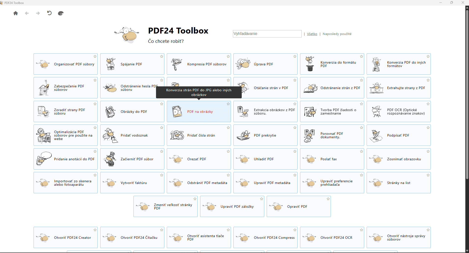 Je to balík nástrojov. Neotváraš ho, aby si prepisoval text v dokumente (hoci aj to v obmedzenej miere vie). Otváraš ho, keď potrebuješ konverzia PDF vo veľkom objeme. Potrebuješ spojiť 50 faktúr do jedného súboru? PDF24. Potrebuješ vytiahnuť strany 5 až 10 a uložiť ich ako samostatné PDF? PDF24. Potrebuješ previesť Word do PDF bez toho, aby si ho posielal na nejaký pochybný server? Zase PDF24.